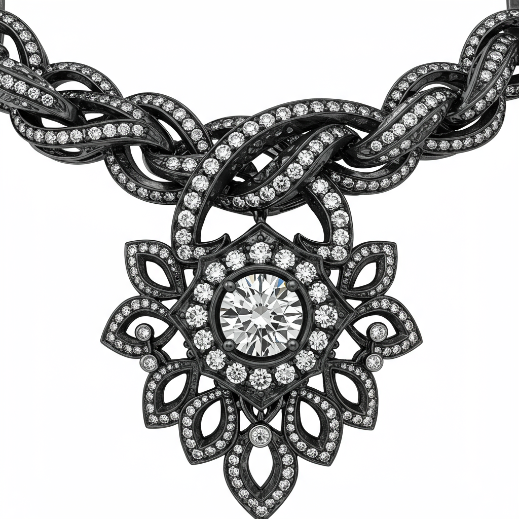 This breathtaking oxidized necklace masterfully blends rugged texture with brilliant scintillation. Crafted in rich 18KT white gold with a deep blackened finish, the design features intricate filigree work surrounding a dazzling central diamond. The surrounding halo of pave diamonds adds ethereal light, creating a dramatic, avant-garde contrast. It is a bold, modern heirloom piece designed to turn heads.