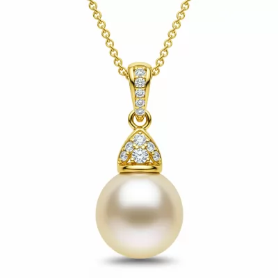 This exquisite pearl and gold necklace features a luminous Akoya pearl gracefully suspended beneath a delicate, diamond-set bale. Crafted in radiant 18KT yellow gold, the design marries timeless elegance with modern sophistication. The single, perfectly spherical pearl catches the light beautifully, making this piece an ideal signature accessory for any occasion. It is a stunning display of classic luxury, designed to be cherished for generations.