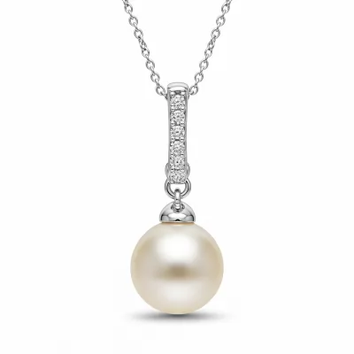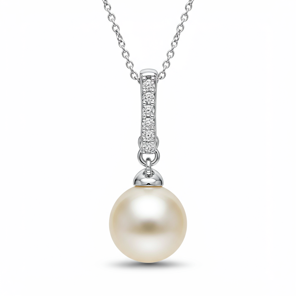 This elegant pearl pendant necklace captures timeless sophistication, featuring a magnificent Akoya pearl suspended beneath a brilliant diamond-set bail. Crafted in luxurious 18KT white gold, the design is both classic and contemporary. The delicate chain allows the pendant to rest gracefully just below the collarbone. This piece is an ideal centerpiece for any formal or everyday ensemble, representing the ultimate fusion of natural beauty and exquisite craftsmanship.