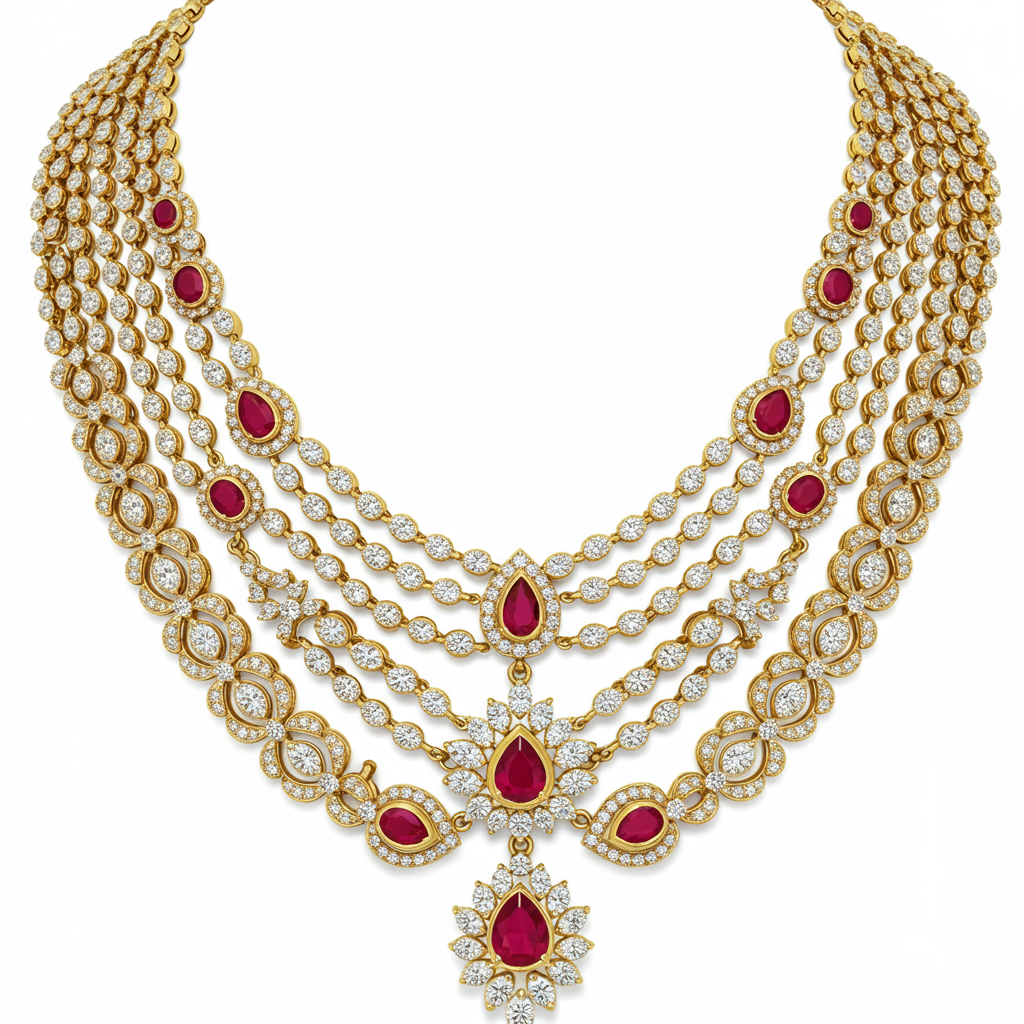 The Rani Haar Necklace is a majestic testament to traditional Indian craftsmanship, designed for the grandest occasions. This elaborate, multi-layered masterpiece is meticulously crafted in 18KT yellow gold, cascading down the décolletage with unparalleled radiance. It features a spectacular confluence of high-clarity VVS diamonds and deep, opulent rubies, creating a mesmerizing contrast. Worn as a statement of royal heritage, this piece embodies eternal luxury and sophisticated glamour, making any bride feel truly regal.