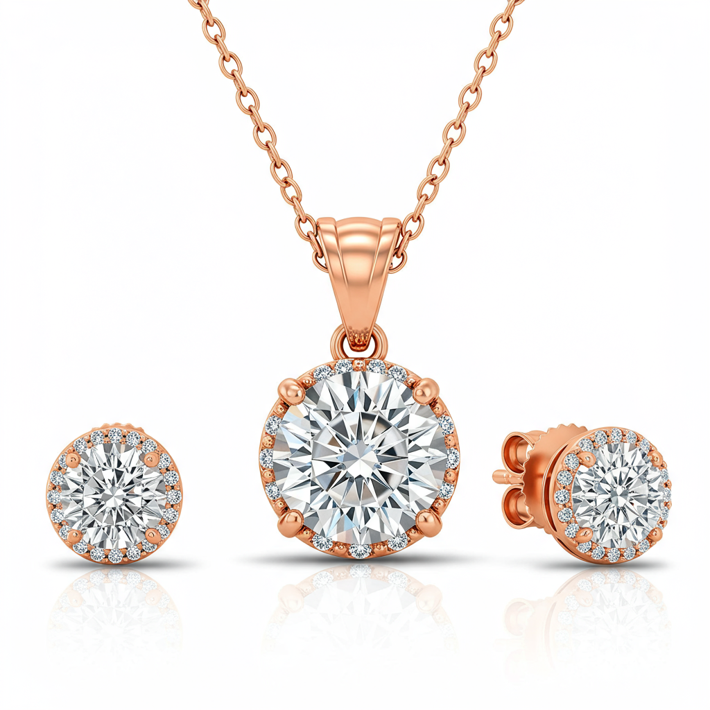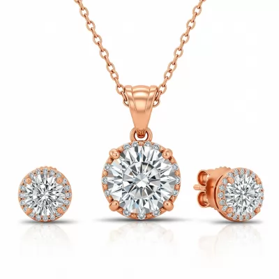 The Rose Gold Necklace Set epitomizes romantic elegance, featuring flawlessly matched diamond pieces crafted in lustrous 18KT rose gold. The solitaire pendant and coordinating stud earrings showcase brilliant-cut diamonds, maximizing light return and sparkle. This collection is designed for seamless transition from daywear sophistication to evening glamour. It is the perfect heirloom quality set, symbolizing enduring love and timeless style.