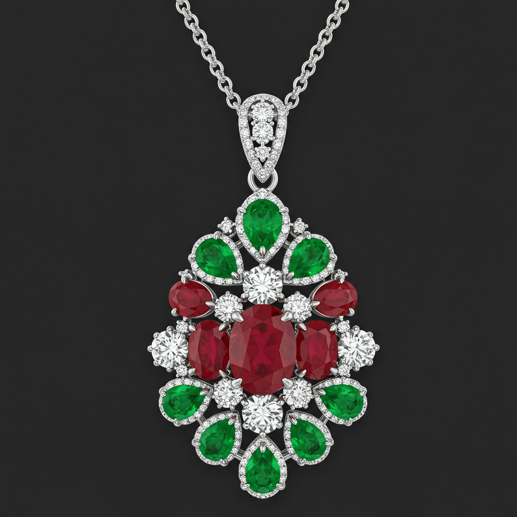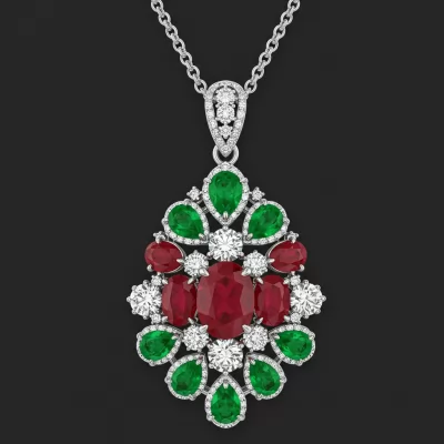 This Ruby and Emerald Necklace is an extraordinary testament to classical opulence, featuring a dramatic centerpiece of deep red rubies and vibrant green emeralds. Crafted in luminous 18KT white gold, the vibrant color stones are meticulously encircled by micropavé brilliant VVS diamonds, highlighting their natural brilliance. The design balances rich tradition with modern craftsmanship, making it a perfect heirloom piece for grand occasions. This piece captures the timeless majesty of regal jewels in a contemporary form.