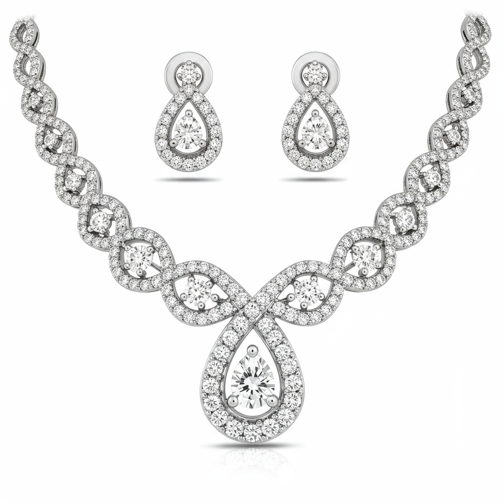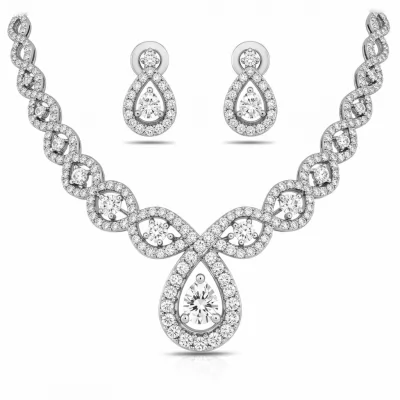 This exquisite necklace and earring set epitomizes modern elegance, crafted in luminous 18KT white gold. The delicate pendant and matching stud earrings feature continuous lines of precision-set round brilliant diamonds. Boasting VVS clarity and G color, the diamonds maximize fire and brilliance. This coordinated ensemble provides sophisticated sparkle, perfect for timeless daily wear or formal occasions.