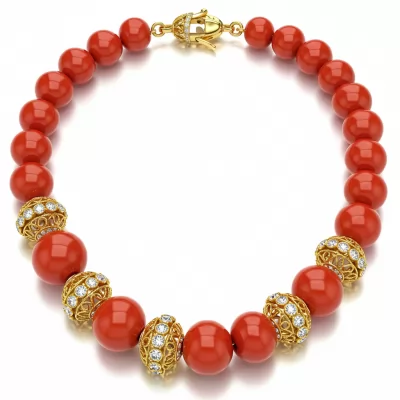 This exquisite traditional coral necklace is a celebration of heritage and vibrant color. Featuring a central arrangement of polished deep-red Sardinian coral beads, the piece is interspersed with intricate 18KT yellow gold filigree work. Subtle brilliant-cut VVS diamonds accent the connecting gold links, adding a sophisticated sparkle that contrasts beautifully with the warm hue of the coral. This heirloom-quality design captures the essence of classic elegance, perfect for formal occasions or cultural attire.