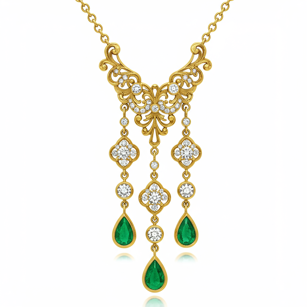 This exquisite antique necklace embodies Victorian elegance, meticulously crafted in 18KT yellow gold. Its intricate lace-like filigree setting cradles a breathtaking array of VVS diamonds and deep green emerald accents. The central tiered drop design creates a mesmerizing focal point, offering a legacy piece of unparalleled vintage luxury. It is a timeless heirloom designed to captivate and enchant for generations.
