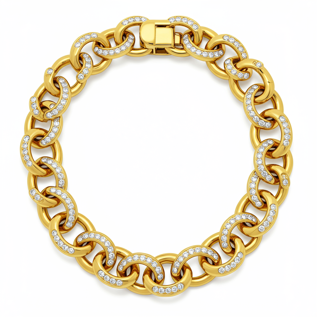 A masterful display of contemporary elegance, this necklace features interconnected polished links crafted in luxurious 18KT yellow gold plating. The design is subtly accented with meticulously set simulated diamonds, offering breathtaking sparkle and precision. This piece perfectly balances bold structure with delicate refinement, making it an ideal statement accessory for any occasion. Its secure clasp ensures comfortable wear while maintaining a sophisticated and substantial profile.