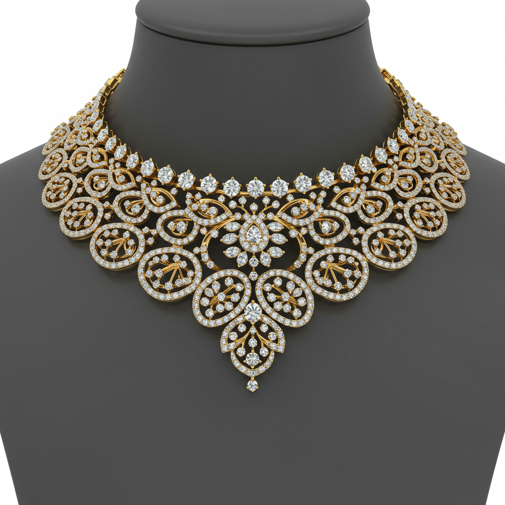 This exquisite 18KT Yellow Gold choker is specifically designed to complement traditional Indian sarees, making it the ultimate bridal statement piece. Featuring intricate geometric and floral patterns set with brilliant VVS round diamonds, it drapes perfectly along the collarbone to maximize visual impact. The piece embodies a perfect blend of heritage artistry and modern high-jewelry precision, ensuring enduring luxury and sophistication. It is an heirloom statement piece ideal for weddings and grand festive occasions, radiating unparalleled brilliance.