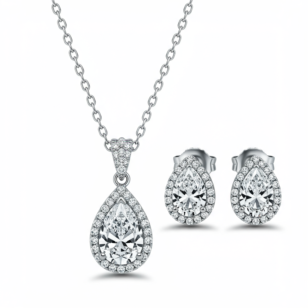 This exquisite crystal necklace set embodies pure elegance and modern luxury. Featuring a stunning central pear-shaped diamond suspended from a delicate halo, the necklace captures light with unparalleled brilliance. The coordinating stud earrings mirror the halo design, completing a look of timeless sophistication. Crafted in polished 18KT white gold, this set is perfect for grand occasions or as a cherished heirloom piece. The design ensures maximum sparkle and wearability.