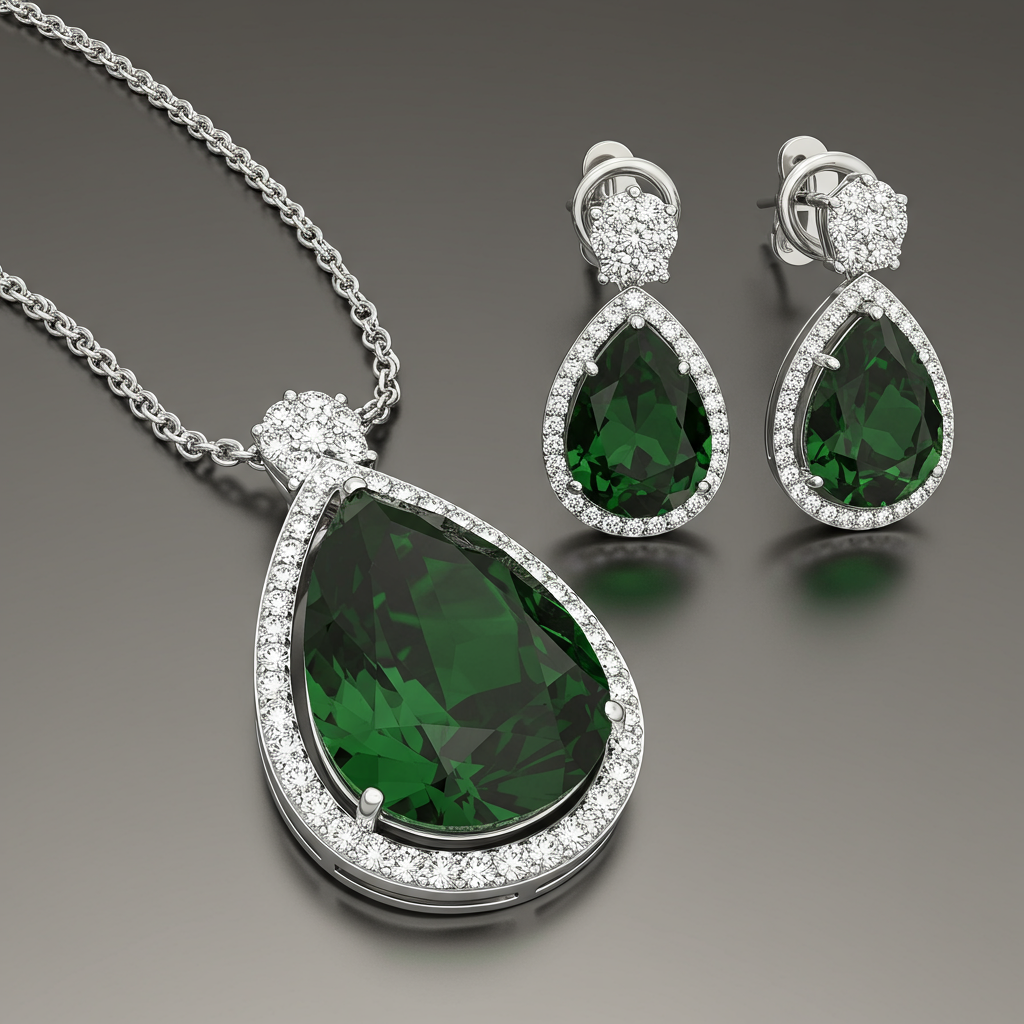 This exquisite dark green necklace set embodies aristocratic elegance, featuring a centerpiece of rich, deep emerald-like stones. The 18KT white gold setting is meticulously crafted to cradle the vivid green gems, interspersed with scintillating VVS natural diamonds. The intricate design creates a luxurious drape and features matching drop earrings, perfect for high-society events or glamorous evening wear. This ensemble is a true statement of enduring beauty and sophisticated craftsmanship.