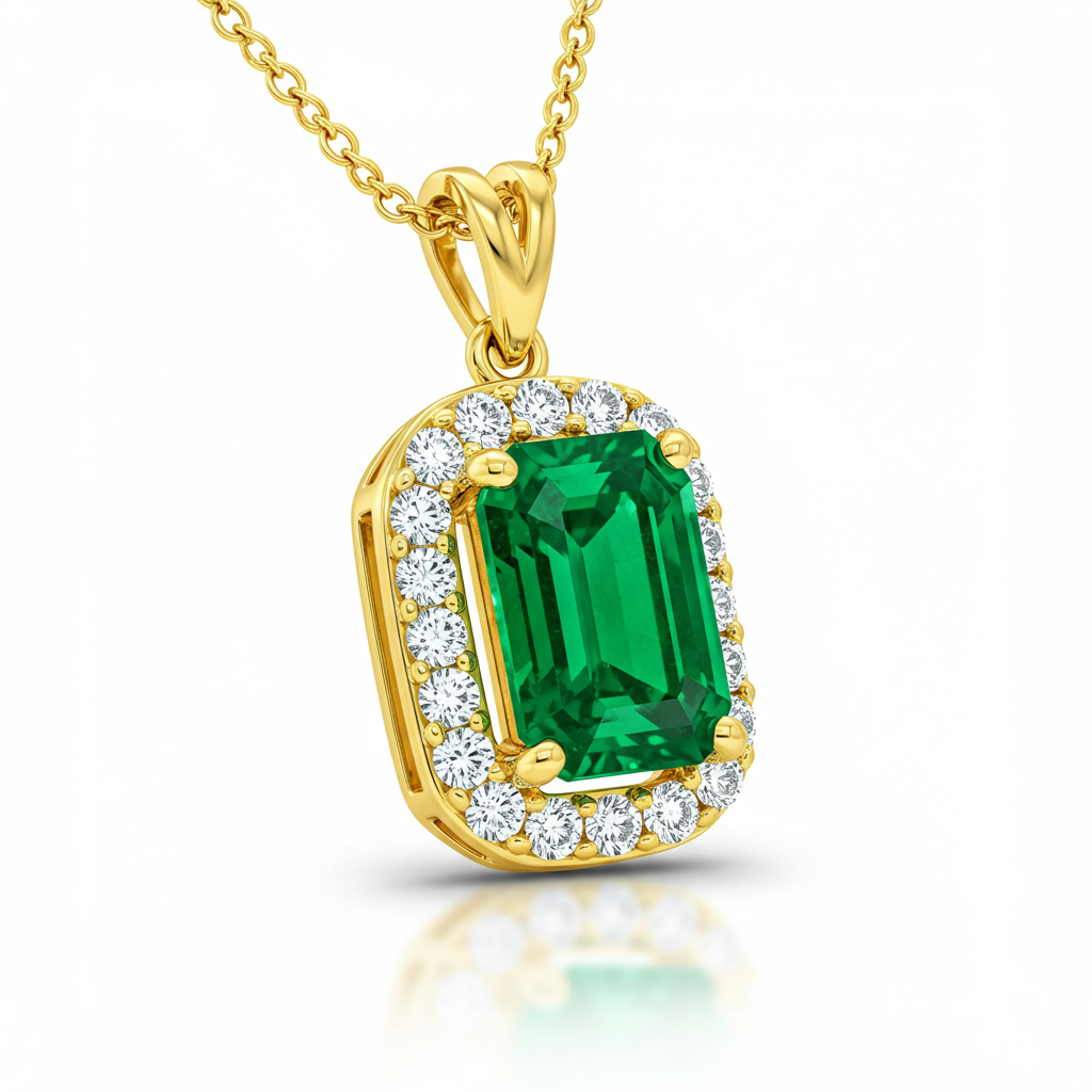 This exquisite Emerald Drop Necklace is a testament to timeless elegance and masterful craftsmanship. Featuring a magnificent, deep-green emerald cut stone, it is encircled by a brilliant halo of meticulously set VVS diamonds. Suspended from an 18KT yellow gold fine chain, the pendant showcases the vibrant gemstone with unparalleled radiance. This piece is designed to be the defining accessory for the most sophisticated occasions, promising an unforgettable presence.