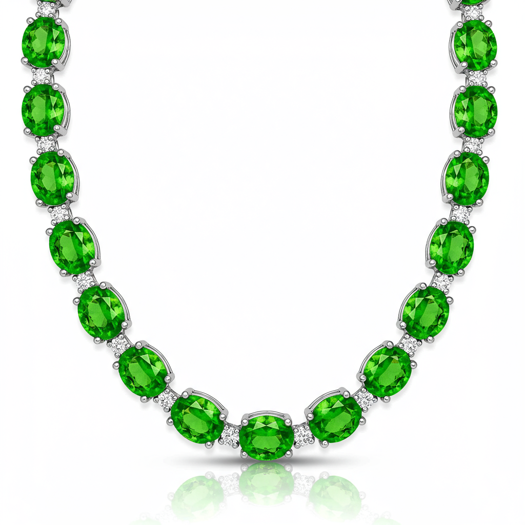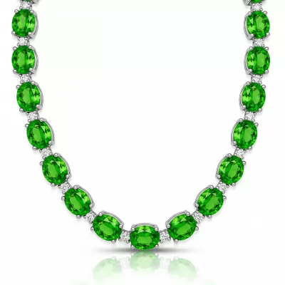 A magnificent expression of elegance, this green colour necklace features a continuous line of vibrant, precisely cut gemstones. Each richly hued green Tsavorite is expertly set, offering unparalleled depth and brilliance across the entire collar. Accented by flawless VVS diamonds, the 18KT white gold setting provides a cool, sophisticated backdrop that enhances the luminosity of the primary stones. This piece is a timeless statement, perfect for gala events or elevating everyday luxury.