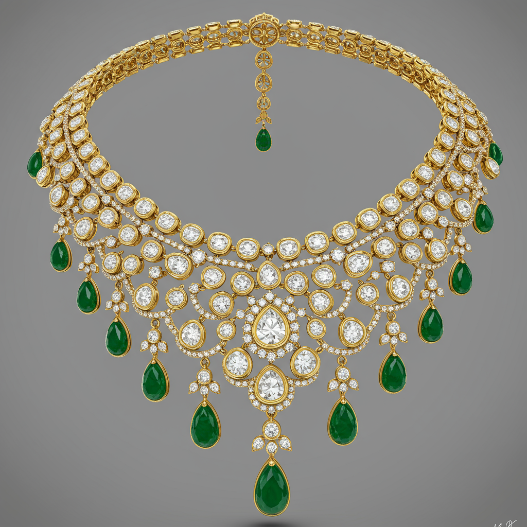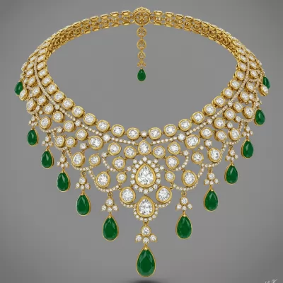 Experience the grandeur of heritage with this exquisite Kundan Necklace, meticulously handcrafted in rich 118KT Yellow Gold. This regal piece features large, beautifully set uncut Polki diamonds forming a dazzling bib structure. Surrounding the traditional elements are accents of brilliant-cut diamonds, enhancing the overall luminescence and intricate detailing. This masterpiece is designed to capture the essence of royal Indian jewelry, making it the perfect statement for weddings and formal celebrations.