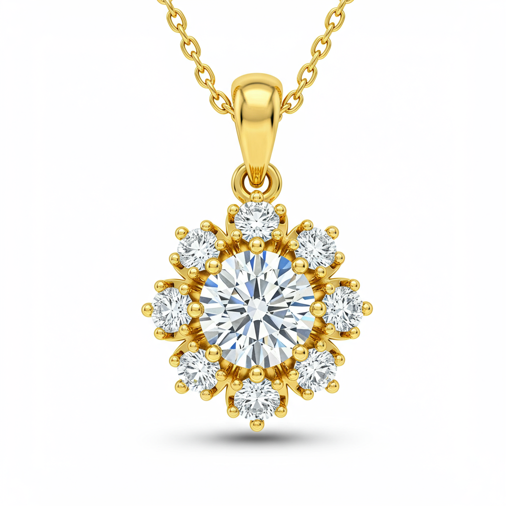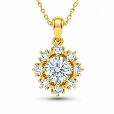 The Kushal Diamond Necklace epitomizes timeless elegance, crafted meticulously in radiant 18KT yellow gold. This exquisite piece features a stunning central cluster setting surrounded by brilliant VVS diamonds, maximizing sparkle and presence. Its delicate yet durable chain ensures comfortable daily wear while maintaining a luxurious appeal. A perfect blend of traditional craftsmanship and contemporary design, this necklace is designed to be an cherished heirloom.