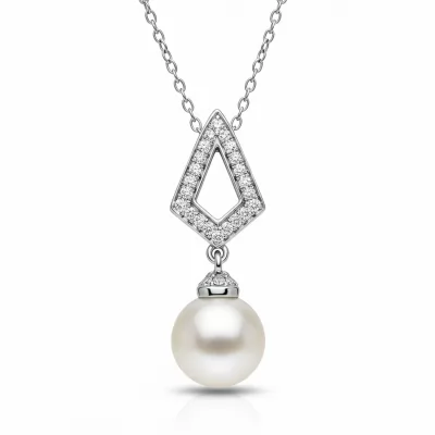 This elegant necklace blends timeless sophistication with contemporary flair, showcasing a lustrous cultured pearl suspended beneath a brilliant diamond halo. Crafted in polished 18KT white gold, the design features meticulous micro-pave setting that maximizes the sparkle of the accompanying VVS diamonds. The delicate adjustable chain ensures the pendant rests perfectly, making it an ideal statement piece for formal occasions or daily luxury. It represents a harmonious balance between classic feminine beauty and modern architectural lines, offering enduring style and grace.