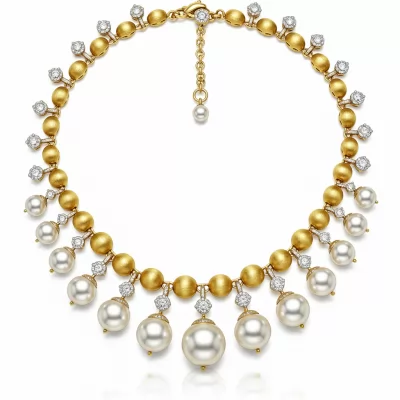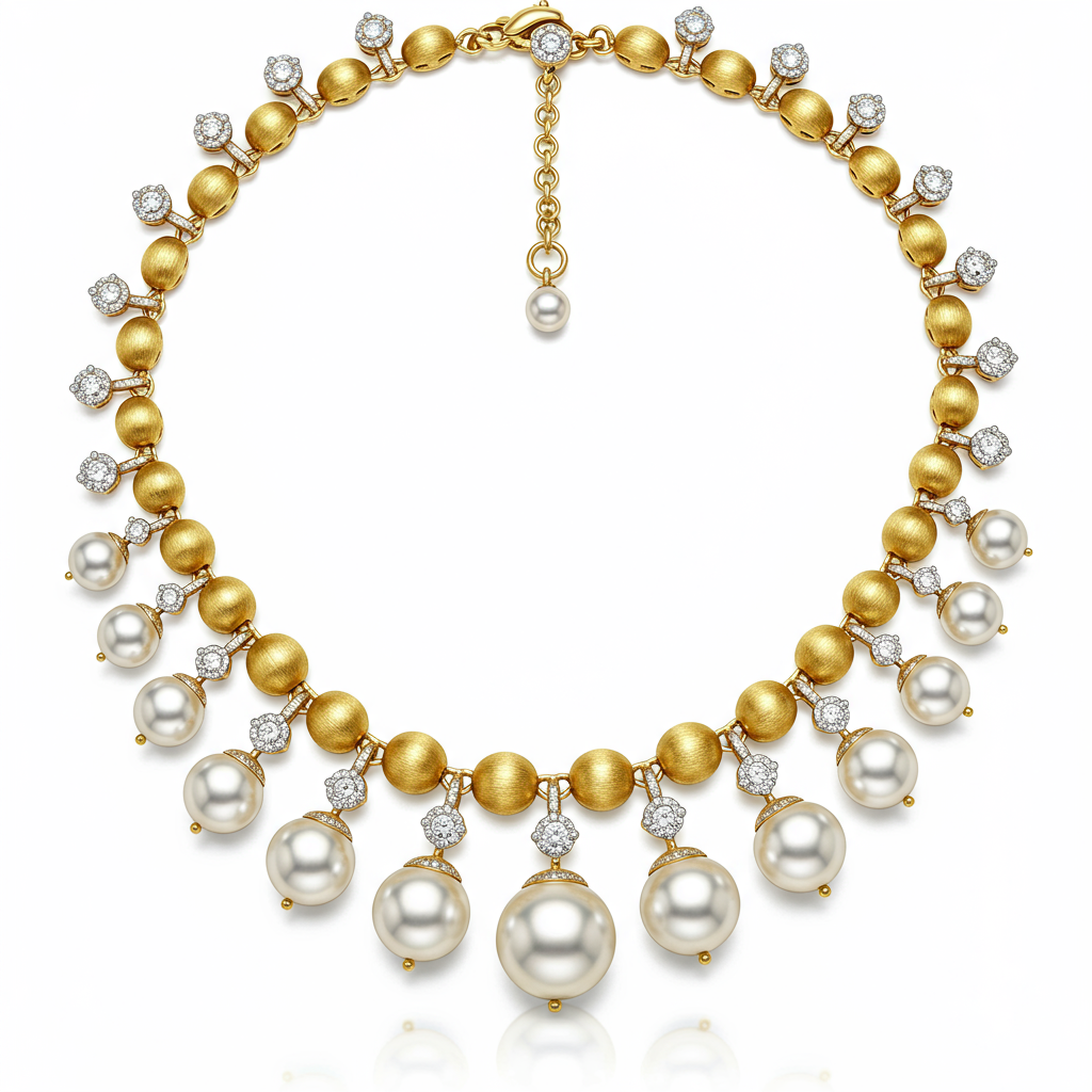 The Moti and Gold Necklace is a sublime fusion of classic elegance and modern design. It features lustrous, perfectly spherical cultured pearls interspersed with meticulously polished 18KT yellow gold links. Delicate pave-set diamond accents add a captivating sparkle, enhancing the inherent glow of the pearls. This heirloom-quality piece is designed to drape gracefully, offering timeless sophistication for any grand occasion.