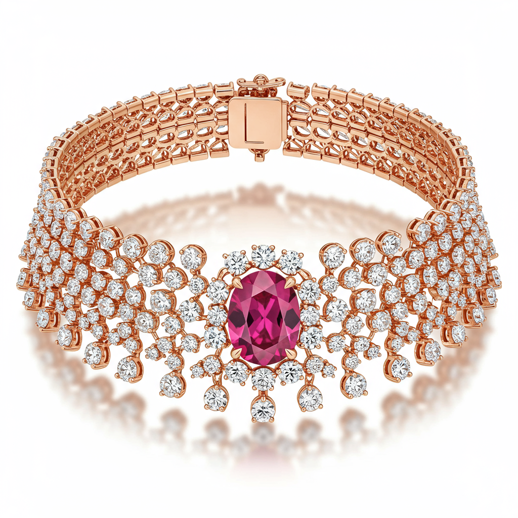 A sophisticated statement piece, this pink choker necklace is meticulously crafted in radiant 18KT rose gold. It features an exquisite array of round diamonds set in a flexible, contouring design that hugs the neck perfectly. This piece effortlessly blends contemporary luxury with classic elegance, making it an indispensable accessory for high-profile events. The breathtaking brilliance of the VVS stones ensures maximum light performance and undeniable sparkle.