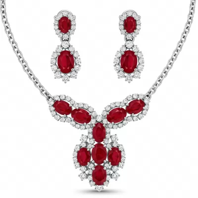 This magnificent 18KT white gold necklace set exemplifies regal elegance, featuring vibrant, deep red oval rubies meticulously clustered as the focal point. Surrounding the precious stones is a dazzling halo and elaborate pave work crafted from VVS clarity diamonds. The included matching drop earrings complete this opulent look, perfect for major evening events and milestones. This set is a true heirloom piece designed for discerning collectors who value exceptional craftsmanship.