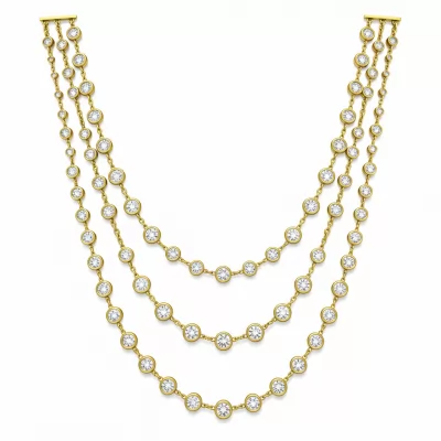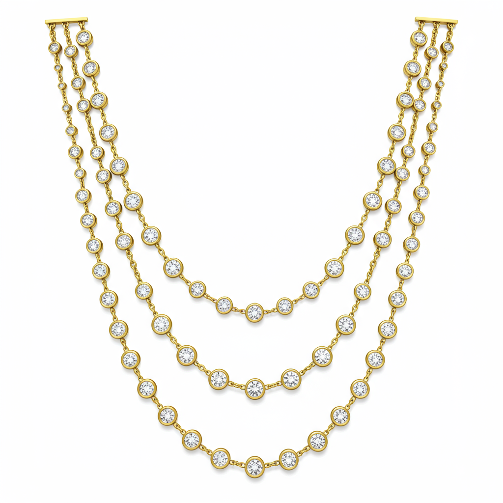 The '3 Layer Necklace Gold' is an exquisite statement piece designed for modern, effortless elegance. Crafted in highly polished 18KT yellow gold, this dynamic design features three interlocking chains of varying lengths, creating a captivating waterfall effect. Each chain is delicately set with brilliant VVS G-H round diamonds, ensuring magnificent sparkle from every angle. This versatile piece requires no additional layering and serves as the ultimate expression of sophisticated luxury.