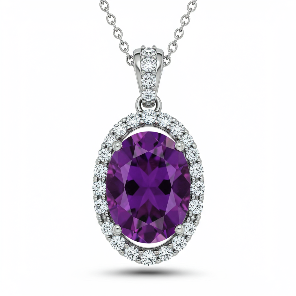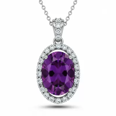 This magnificent amethyst necklace captures the regal depth of the finest gemstones in a timeless design. A striking, large oval amethyst, renowned for its rich violet hue, forms the centerpiece, flawlessly framed by a shimmering halo of meticulously set VVS diamonds. Crafted in luxurious 18KT white gold, the design balances vintage opulence with modern elegance. This pendant is an ideal statement piece, promising breathtaking sparkle and sophisticated color saturation for any distinguished collector.