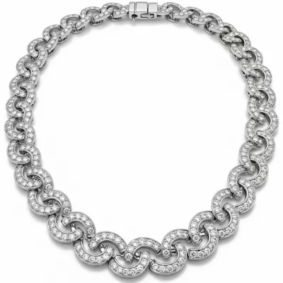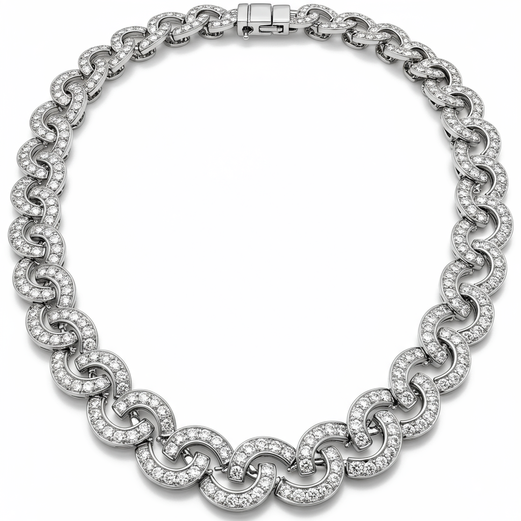This exquisite 18KT white gold necklace pays homage to iconic Roman designs, featuring a bold, interlocking pendant structure. It is meticulously paved with brilliant-cut VVS diamonds, creating a continuous stream of captivating light. The substantial design and flawless craftsmanship make this piece a definitive statement of luxury and elegance. Its adjustable chain ensures perfect positioning, draping gracefully along the collarbone.