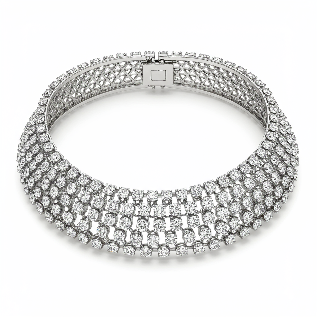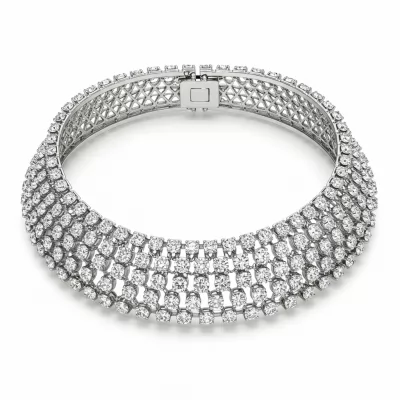 This exquisite girls' choker necklace features a delicate band of 18KT white gold, designed for sophisticated young wearers. The flexible construction allows it to sit perfectly along the collarbone, defining elegance and modern charm. It is meticulously set with brilliant-cut diamonds in a continuous pave setting, catching the light with every movement. A signature piece, this choker embodies subtle luxury and exceptional craftsmanship, making it ideal for special occasions.
