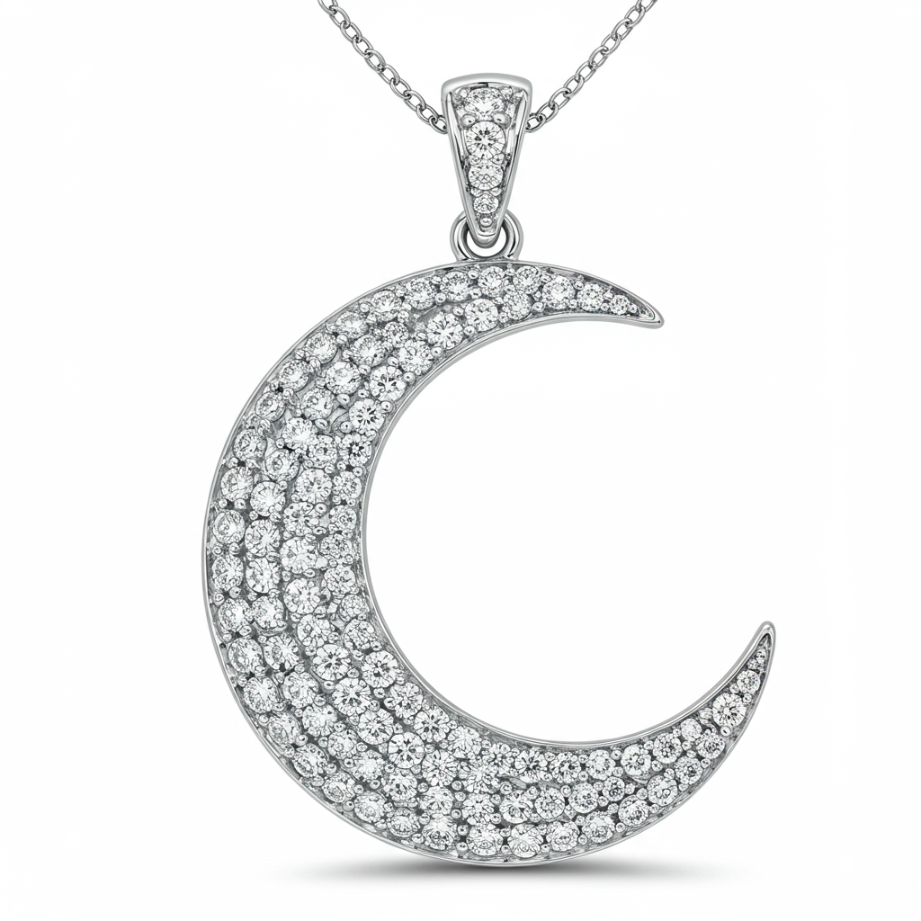 The Moon Necklace captures celestial beauty in a flawless crescent design. Crafted in 18KT white gold, this elegant piece features a continuous stream of VVS pave diamonds that illuminate its graceful curve. Symbolizing guidance and feminine power, the pendant hangs delicately on a fine chain, offering stunning brilliance suitable for both day and evening wear. This iconic design makes a profound statement of sophistication and eternal charm.