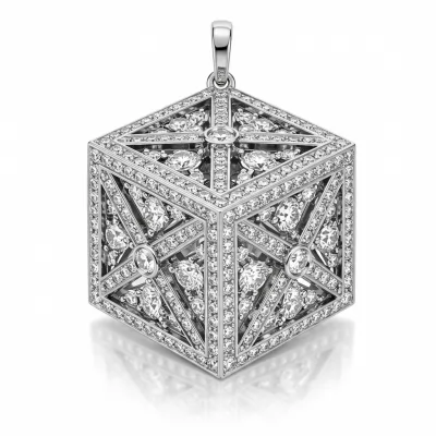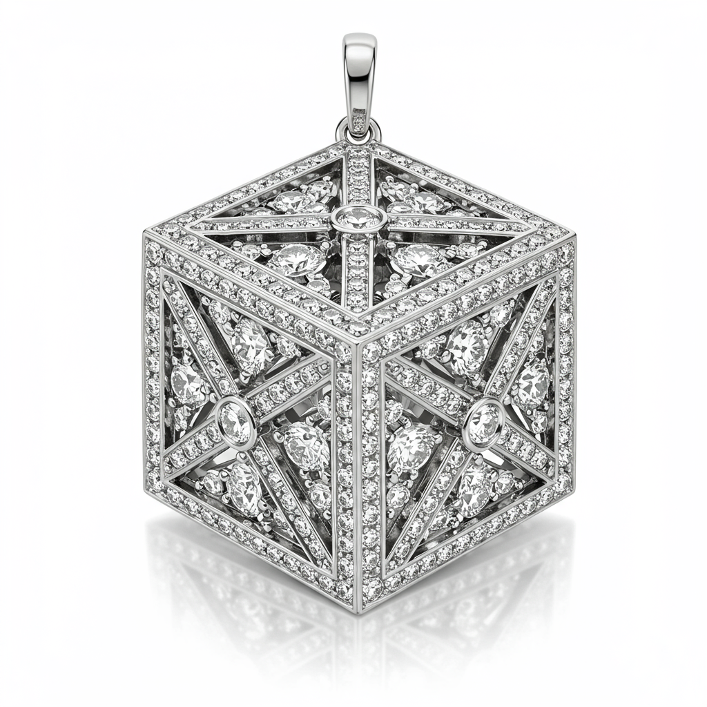 The 'necklace box' pendant is an architectural marvel, featuring crisp 18KT white gold lines that define its unique cubic structure. This highly polished geometric design is accented with meticulously set VVS diamonds along its edges, capturing light from every angle. Functionally elegant, the piece opens subtly, allowing for the secure storage of a treasured memento. It is a modern interpretation of the classic locket, offering sophistication and intimate meaning, perfect for the discerning wearer.