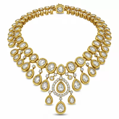This regal polki necklace embodies the grandeur of heritage Indian jewelry, meticulously crafted in radiant 18KT yellow gold. The centerpiece features an array of meticulously hand-set, naturally shaped polki diamonds, creating a magnificent, ethereal glow. This traditional design is elevated by brilliant-cut VVS diamond accents, adding a layer of contemporary sparkle and defining the intricate contours. An heirloom piece destined to be cherished, this necklace provides a breathtaking statement of luxury and timeless elegance, perfect for major ceremonial occasions.