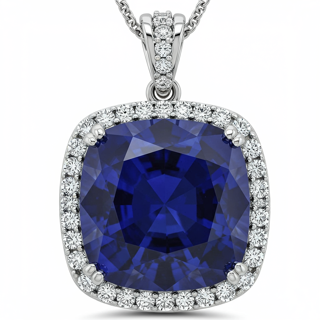 The Sapphire Aurora Necklace epitomizes regal elegance, featuring a magnificent cushion-cut natural blue sapphire at its core. This statement pendant is surrounded by a brilliant halo of meticulously set VVS diamonds, amplifying the sapphire's deep, velvety hue. Crafted in lustrous 18KT white gold, the design ensures maximum light reflection and enduring sophistication. It hangs delicately from an adjustable fine chain, making it a timeless heirloom piece suitable for any grand occasion.