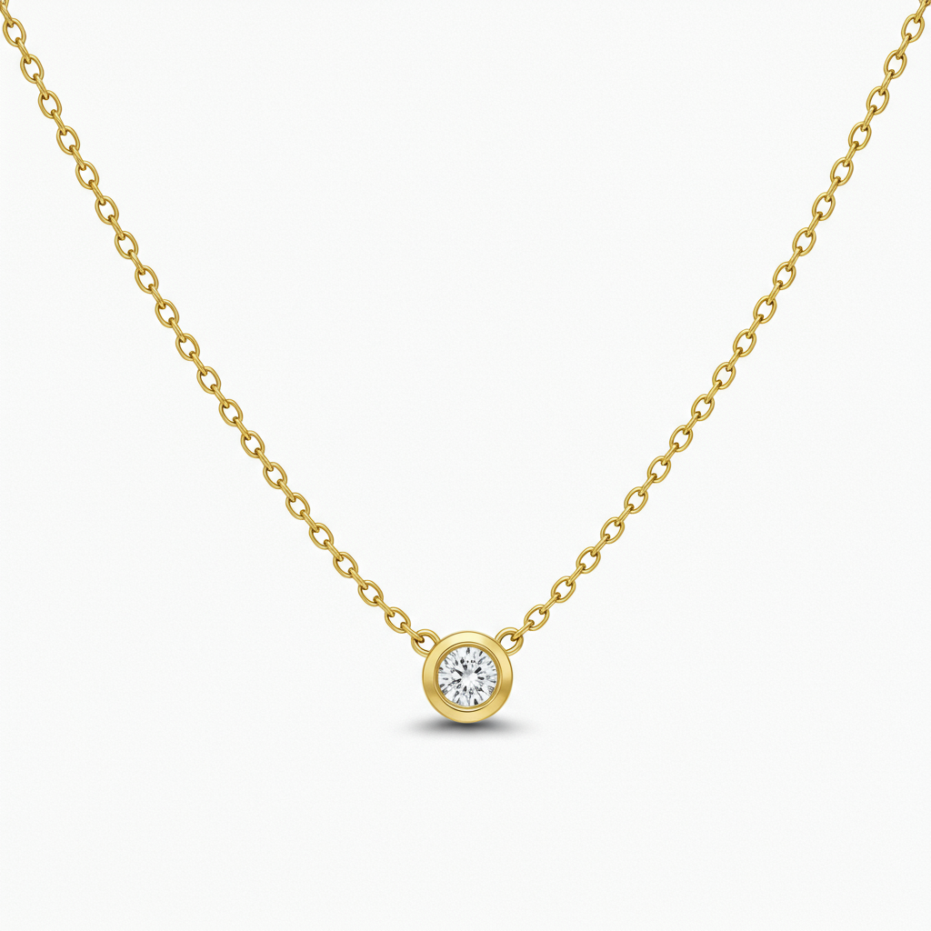 The 1 gram gold necklace embodies minimalist luxury and modern sophistication. Crafted in lustrous 18KT Yellow Gold, this incredibly lightweight piece offers everyday elegance without compromise. It features a single, brilliant-cut VVS G-color diamond secured in a delicate bezel setting. The design prioritizes comfort and subtle sparkle, making it the perfect layering piece or a standalone statement of quiet refinement.