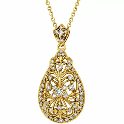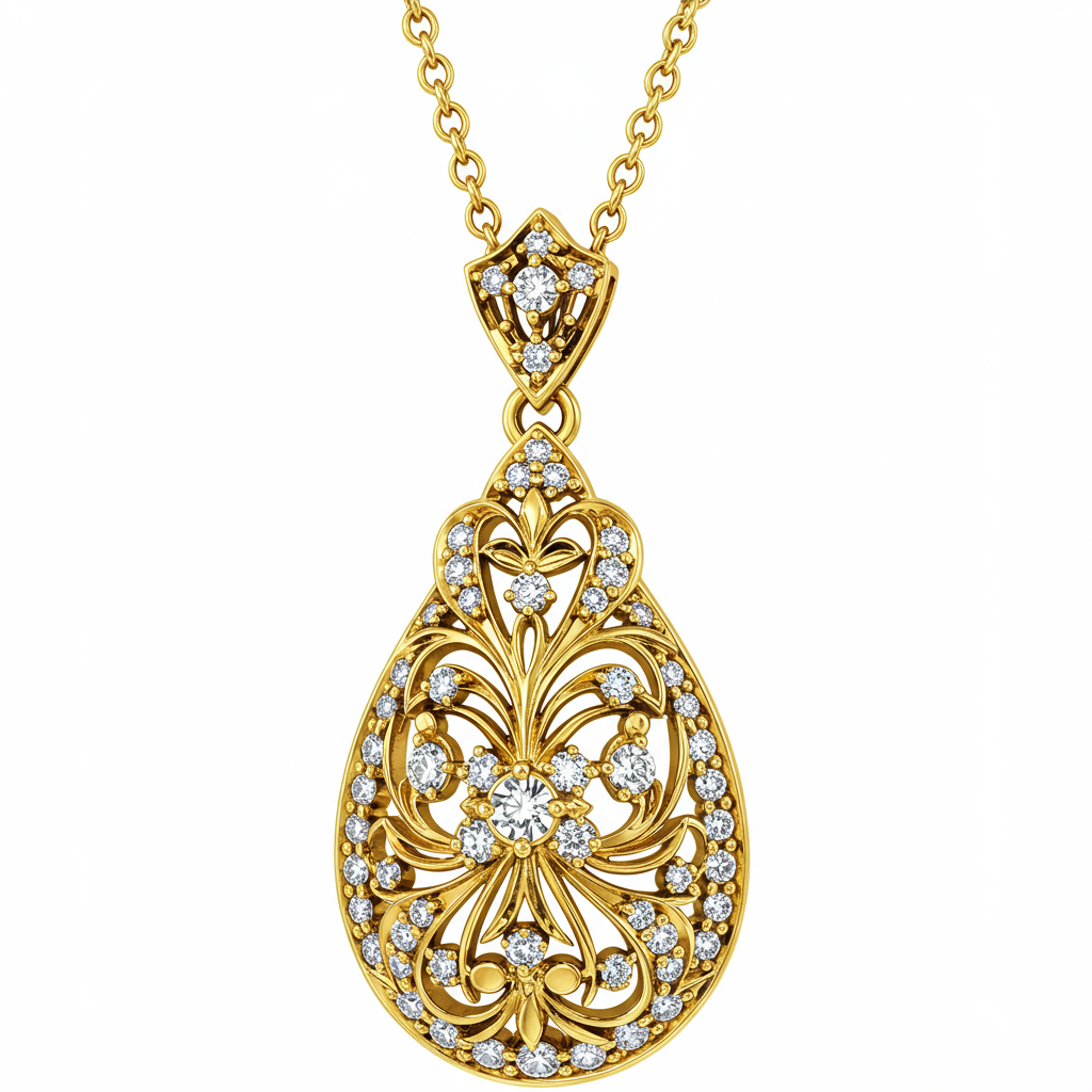 This magnificent antic necklace design revives the splendor of bygone eras, featuring intricate filigree work crafted in rich 18KT yellow gold. Adorned with 2.35 carats of brilliant VVS diamonds, the design flows elegantly, culminating in a sophisticated drop pendant. It stands as a testament to exceptional craftsmanship and timeless luxury, perfect for the grandest occasions.