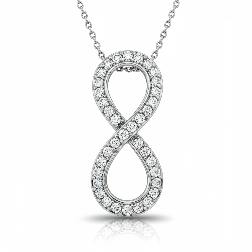 This exquisite infinity necklace symbolizes everlasting love and connection, crafted in radiant 18KT white gold. The fluid, interlocking loops are meticulously set with brilliant VVS round diamonds in a delicate micro-pave setting. Its timeless design transitions seamlessly from daily wear to elegant evening events. A testament to superior craftsmanship, this piece offers unmatched sparkle and enduring elegance.