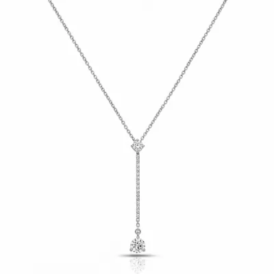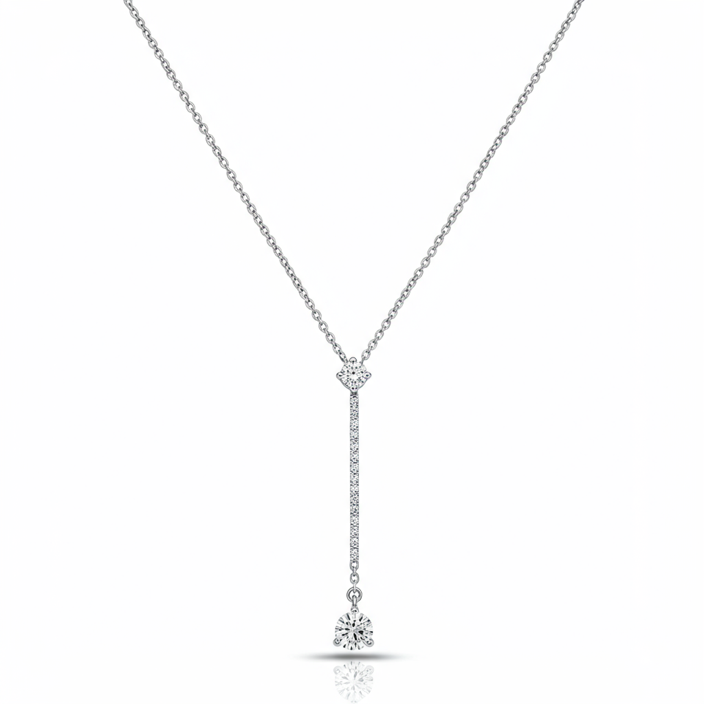 This elegant lariat necklace features a fluid, adjustable drop design crafted in luminous 18KT white gold. A delicate chain is punctuated by pavé-set diamonds that trace the vertical drop, culminating in a brilliant solitaire diamond accent. This versatile piece offers stunning elongation, making it perfect for complementing low-cut necklines or adding sophisticated sparkle to professional attire. It is the epitome of modern luxury, designed to move gracefully with the wearer.