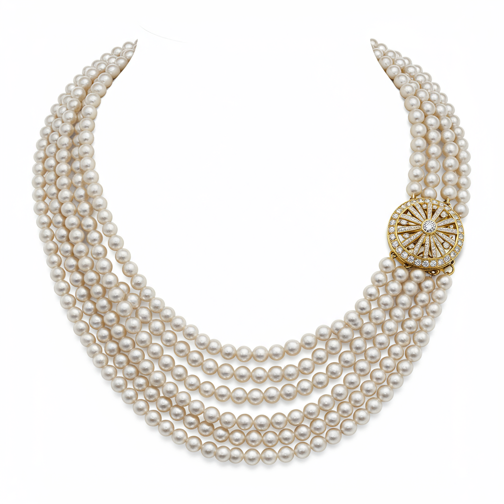 This exquisite heirloom-quality necklace is designed to perfectly complement the elegance of a traditional saree ensemble. It features multiple strands of lustrous, creamy white pearls, draped delicately to create a regal silhouette. The necklace is anchored by a central 18KT yellow gold diamond-studded clasp, showcasing intricate traditional detailing. This true statement piece captures the grandeur of Indian wedding jewelry while offering refined modern craftsmanship. It is the definitive accessory for culturally significant occasions.