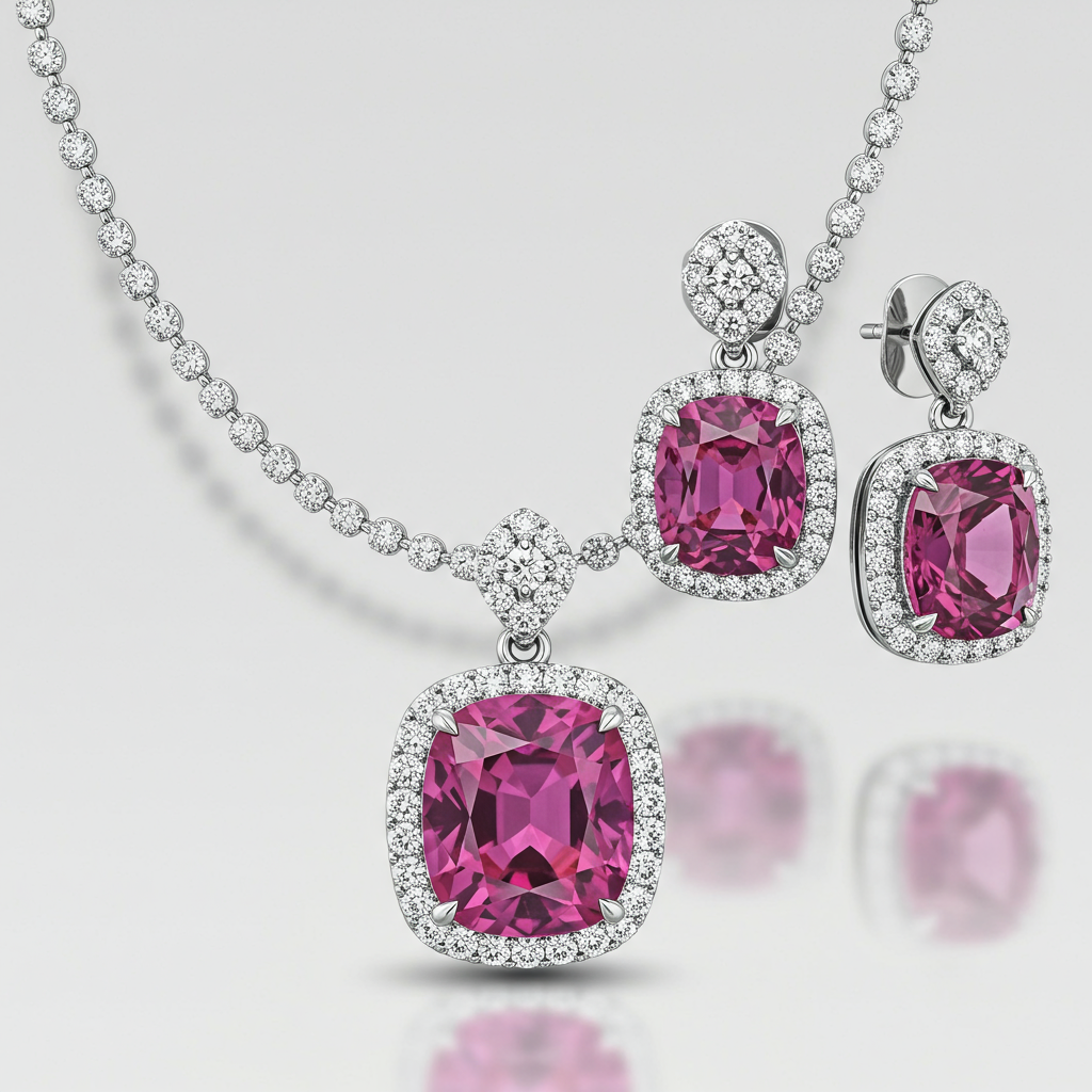 The Pink Radiance Set is a breathtaking ensemble crafted in lustrous 18KT white gold, featuring a magnificent cushion-cut pink sapphire centerpiece surrounded by a brilliant halo of VVS diamonds. This coordinated necklace and earring set epitomizes timeless elegance and sophistication, offering versatility and glamour. The exceptionally clear pink hues of the main stones create a captivating focal point, reflecting light with unparalleled intensity. It is an heirloom-quality collection designed for momentous occasions.