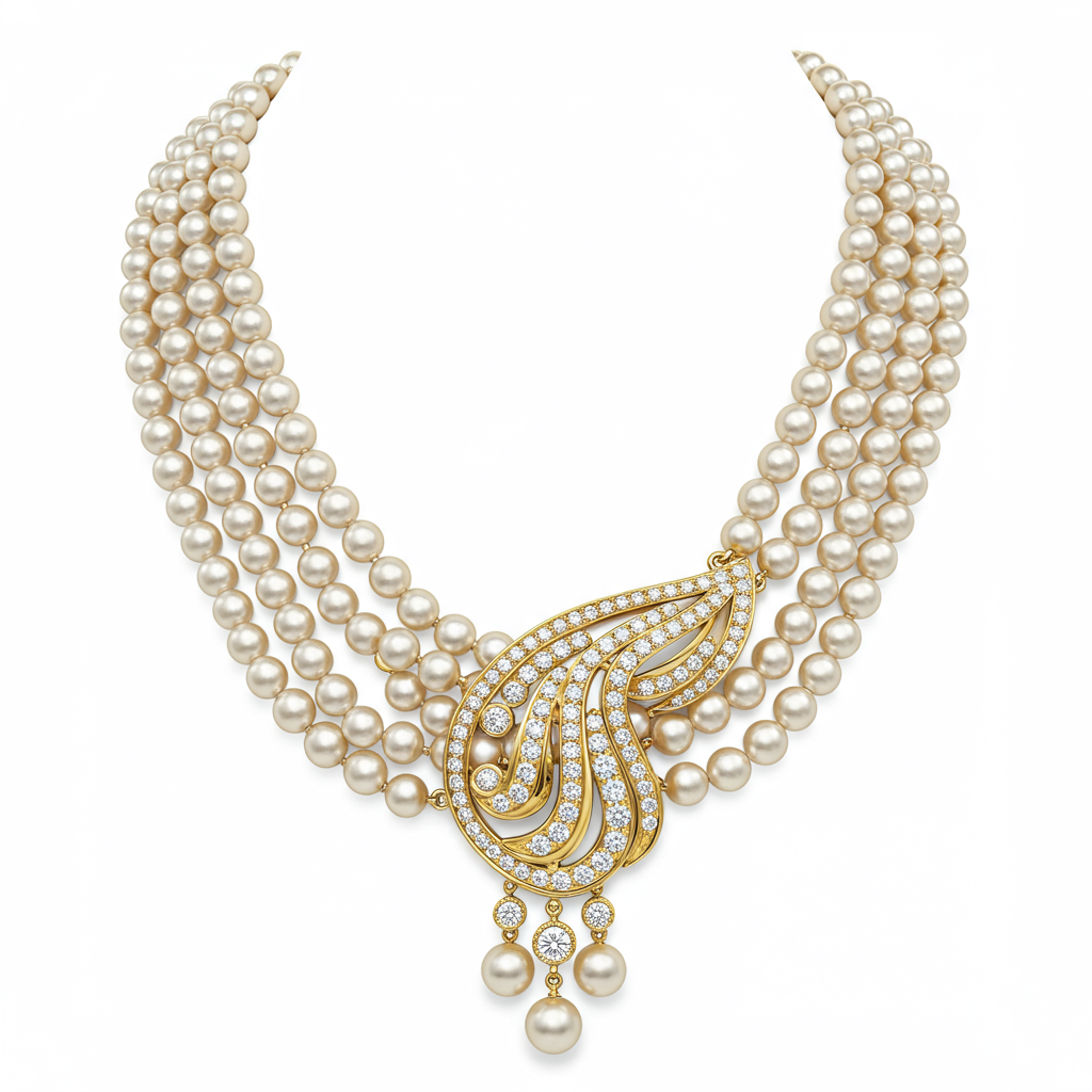 The 'Saree with Pearl Necklace' is a masterpiece of traditional Indian craftsmanship, designed to perfectly complement ceremonial attire. It features multiple luxurious strands of highly lustrous cultured pearls, meticulously hand-knotted and flowing into a stunning centerpiece crafted from 18KT yellow gold. This focal element is intricately paved with brilliant VVS diamonds, creating a dazzling cascade of light and texture. This statement piece embodies timeless grace and is the ultimate luxurious accessory for grand occasions.