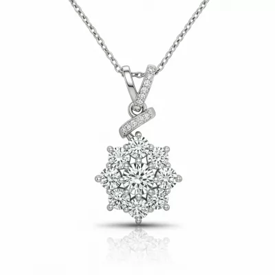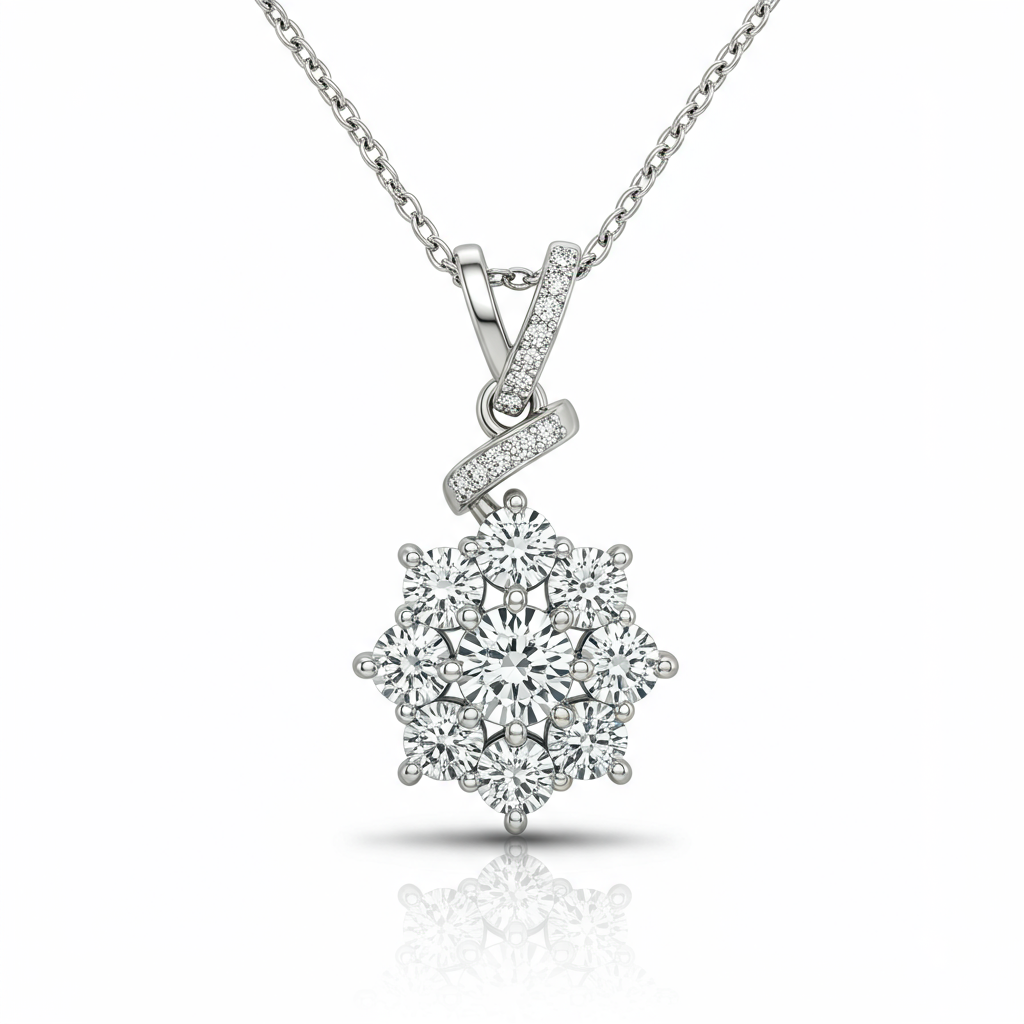 The shree hari necklace is a magnificent tribute to divine brilliance, designed to capture light from every angle. It features a stunning cluster of VVS-grade, G-H colored round diamonds meticulously set in polished 18KT white gold. The central diamond provides a breathtaking focal point, symbolizing clarity and enduring commitment. This exquisite piece balances classical symmetry with modern craftsmanship, making it an heirloom-quality statement for sophisticated wear.