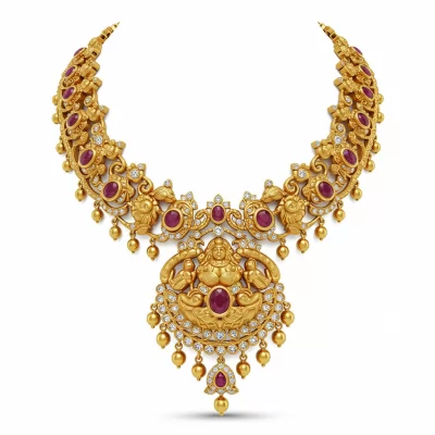 The Temple Gold Necklace is a magnificent tribute to South Indian heritage and artistry. Crafted in radiant 18KT yellow gold, this piece features intricate, sculpted motifs inspired by ancient temple architecture, including goddesses and floral elements. It is richly embellished with high-quality cabochon rubies and subtle accent diamonds, creating a breathtaking display of traditional color and modern sparkle. This substantial necklace embodies divine elegance, making it the perfect heirloom piece for significant ceremonial occasions and weddings.