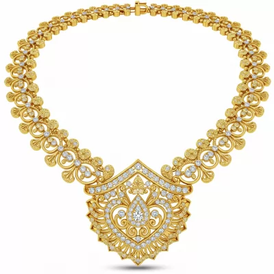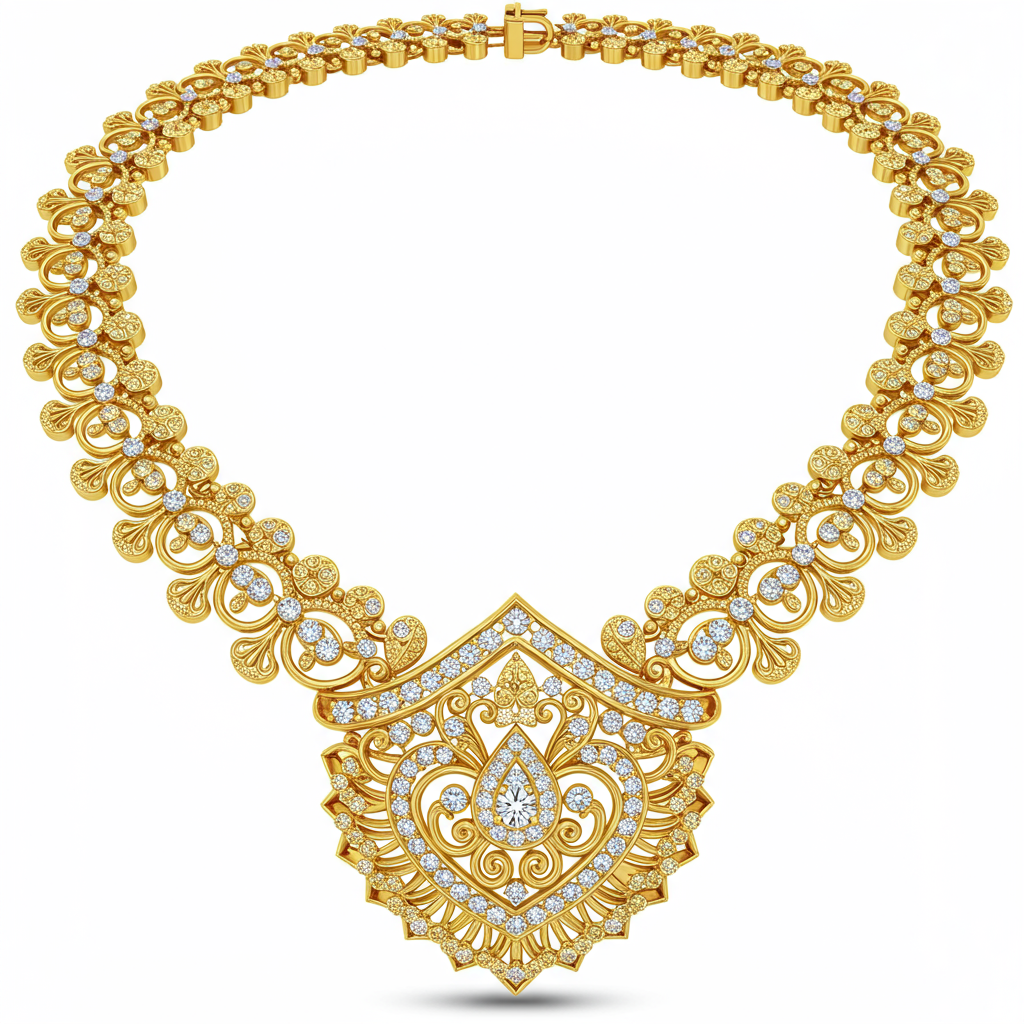 This magnificent 2 Tola Gold Necklace embodies traditional grandeur and luxurious craftsmanship. Expertly cast in 18KT yellow gold, its substantial weight speaks to enduring quality and richness. The central design incorporates intricate filigree work accented by brilliant clusters of high-quality diamonds. This piece serves as a timeless statement, perfect for weddings or significant cultural celebrations.