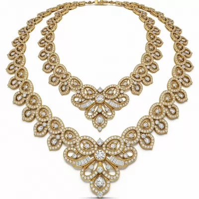 The Artificial Necklace Set embodies regal splendor, meticulously combining the richness of 18KT yellow gold with a dazzling arrangement of high-quality VVS diamonds. This magnificent piece features a central drop motif framed by brilliant round and accent baguette diamonds, creating a breathtaking cascade of light. The design is meticulously handcrafted, utilizing advanced jewelry techniques to ensure exceptional comfort and structural integrity. It stands as a timeless heirloom, perfect for the most sophisticated collector seeking unparalleled brilliance and majestic presence at any grand occasion.
