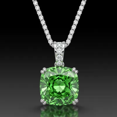 The 'green diamond necklace' is an emblem of rare elegance, centered around a spectacular Fancy Intense Green diamond of breathtaking color saturation. This exquisite cushion-cut gemstone is framed by an 18KT white gold setting, designed to maximize brilliance and contrast. The delicate chain and supporting bail are micro-pave set with brilliant VVS round diamonds, adding exceptional sparkle. A truly sophisticated piece, this necklace ensures a captivating presence, perfect for formal occasions and cherished celebrations.