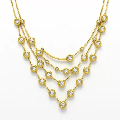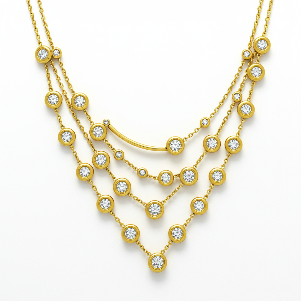 This exquisite 18KT yellow gold necklace strikes the perfect balance between classic craftsmanship and contemporary flair. Weighing approximately 10 grams, it features a delicate, layered chain design subtly interspersed with brilliant-cut diamonds set in refined bezel settings. The fluid movement of the design ensures it catches the light beautifully, making it an ideal piece for both daily wear and special occasions. This stunning example of everyday luxury is meticulously crafted to become a timeless heirloom. It utilizes high-quality VVS clarity diamonds to ensure maximum brilliance.