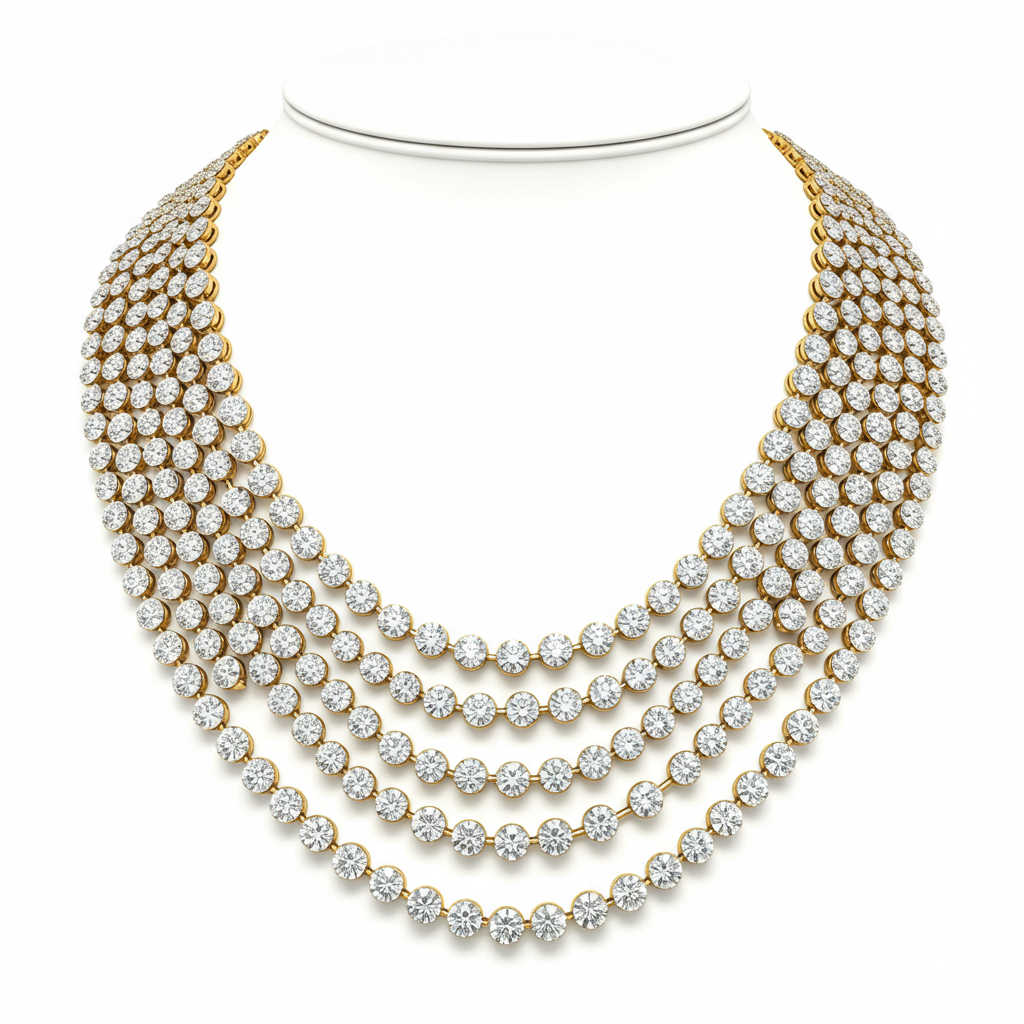 The Bridal Gold Choker Necklace is a masterpiece crafted in luminous 18KT Yellow Gold, designed to grace the neck of the modern bride. This intricate piece features a densely set mosaic of over eight carats of VVS round brilliant diamonds, maximizing light return and scintillation. Its flexible structure ensures a flawless, comfortable fit, lying perfectly as a second skin. This statement choker represents eternal elegance and is the definitive centerpiece for a grand wedding ensemble.