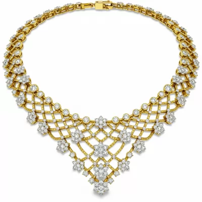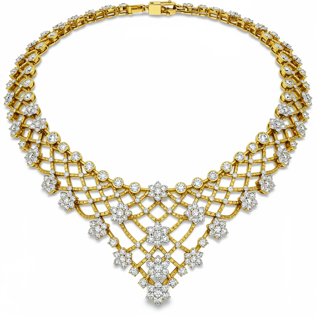 This magnificent bridal gold necklace is the epitome of heirloom quality and timeless glamour. Crafted in radiant 18KT yellow gold, it features an intricate lattice design draped across the décolletage. Over 200 meticulously set VVS diamonds sparkle with unparalleled brilliance, creating a cascade of light. This piece ensures the bride captivates every eye on her momentous day, blending traditional luxury with sophisticated contemporary artistry.