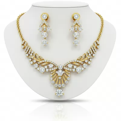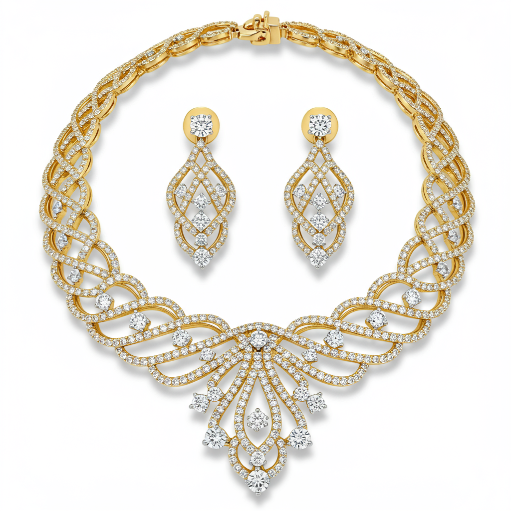 This magnificent bridal necklace set is the epitome of traditional grandeur redefined for the modern bride. Expertly crafted in 18KT yellow gold, the design features intricate lattice patterns fully encrusted with brilliant VVS round diamonds, capturing light from every angle. The accompanying drop earrings mirror the necklace's luxurious motif, creating a harmonious and breathtaking ensemble. This heritage piece is designed to be the centerpiece of the wedding day, symbolizing eternal commitment and unparalleled luxury.