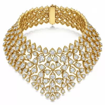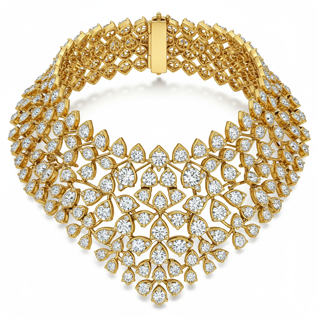 This exquisite choker necklace embodies modern grandeur and timeless luxury. Crafted in radiant 18KT yellow gold, the structured design features a complex articulation that ensures comfort and flawless drape around the neckline. It showcases a dense pave setting of numerous brilliant-cut VVS diamonds, creating a continuous, dazzling sheet of light. This piece serves as the ultimate statement accessory, perfect for high-profile events and exclusive soirées, symbolizing unparalleled sophistication.