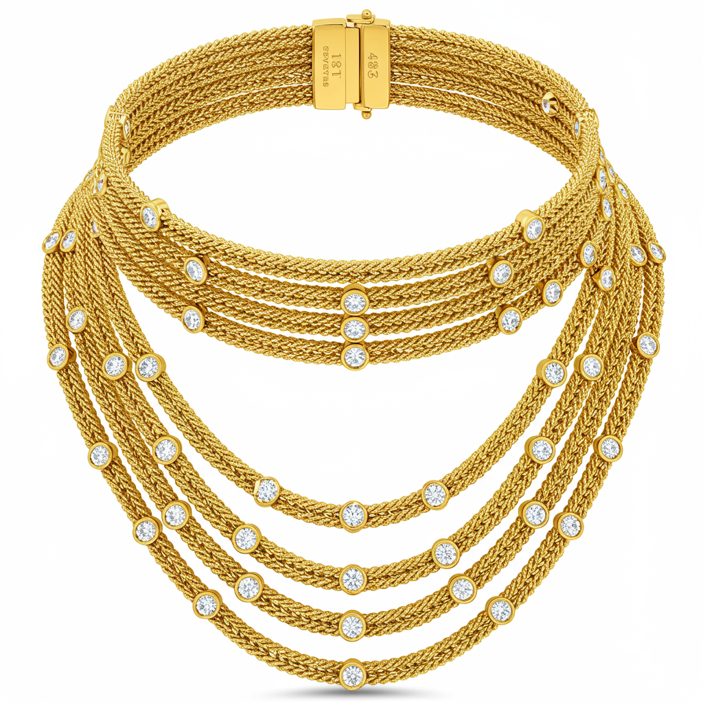The Dubai Gold Necklace is an opulent statement piece, embodying traditional Arabian grandeur with contemporary finesse. Crafted in luminous 18KT Yellow Gold, its intricate mesh design cascades elegantly around the neck. This masterpiece is meticulously set with brilliant-cut VVS diamonds, offering an unrivaled sparkle and magnificent presence. It is the perfect heirloom piece, symbolizing wealth and sophisticated luxury.