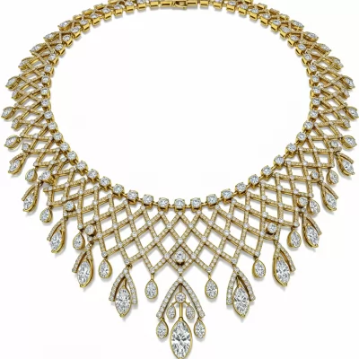 The Dubai Majesty Necklace embodies opulent Arabian craftsmanship, designed for the grandest occasions. Crafted in radiant 18KT yellow gold, this breathtaking piece features sweeping architectural lines set entirely with magnificent VVS clarity diamonds. The centerpiece showcases three substantial marquise-cut diamonds, complemented by 120 precision-set round accents that capture light from every angle. This chandelier design drapes elegantly, making a powerful statement of timeless luxury and unparalleled brilliance.
