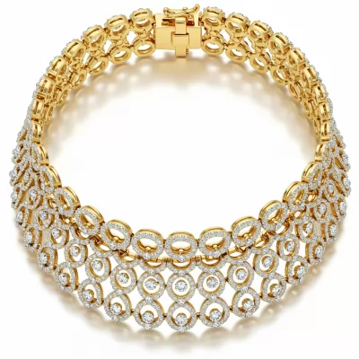 This light weight gold choker necklace is the epitome of modern elegance, designed for daily sophistication. Crafted in brilliant 18KT yellow gold, the delicate structure hugs the neckline, creating a continuous line of effortless luxury. A subtle array of VVS diamonds illuminates the piece, offering a gentle yet undeniable sparkle. Perfect for layering or worn solo, this choker transitions seamlessly from casual daytime wear to evening affairs.