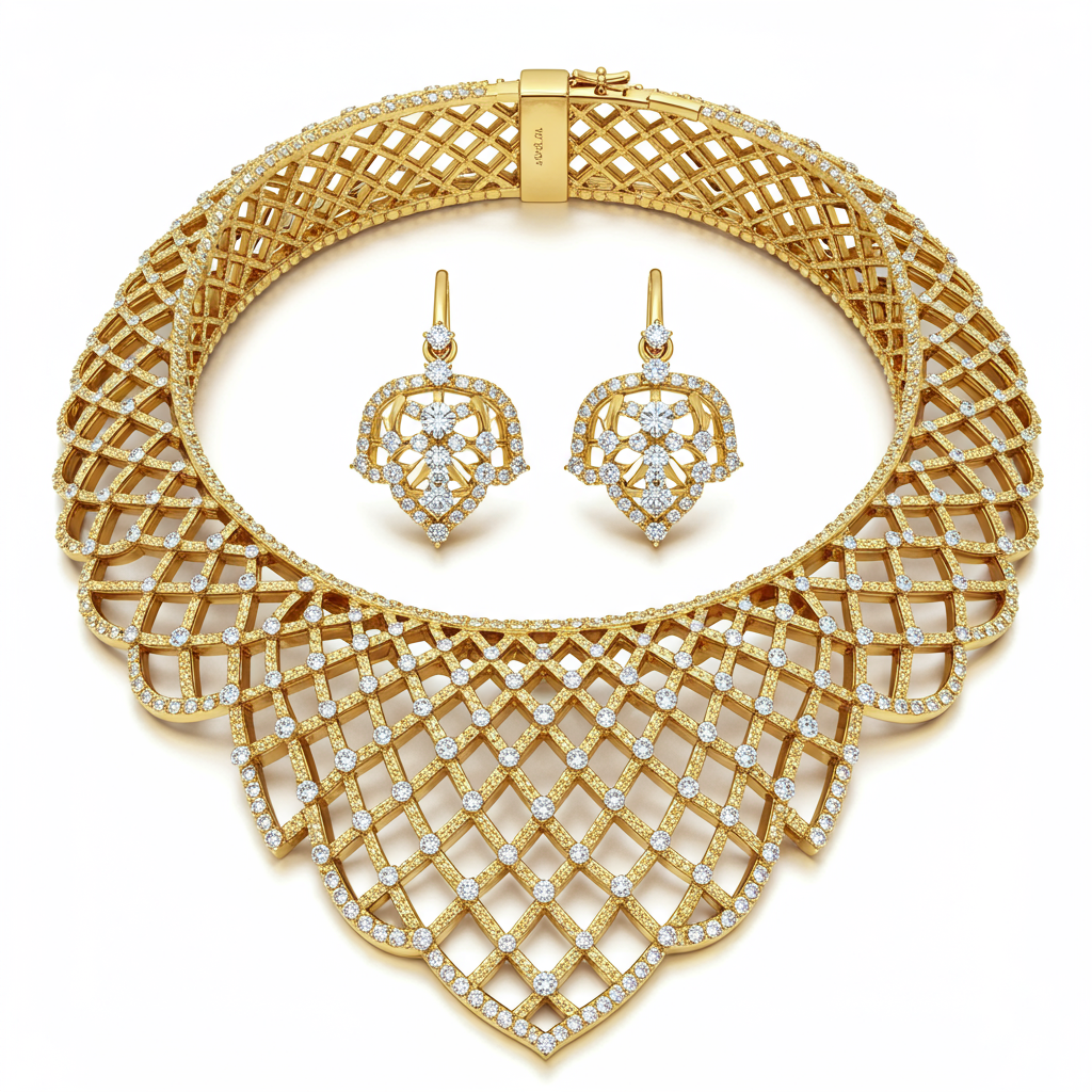 The Malabar Necklace Set embodies traditional grandeur reimagined for the modern era. Crafted in radiant 18KT yellow gold, this ensemble features an intricate diamond lattice design that drapes elegantly along the neckline. Each piece is meticulously set with brilliant VVS diamonds, catching the light with unparalleled fire. Complete with matching drop earrings, this set is the perfect statement of luxury and timeless sophistication for grand occasions.